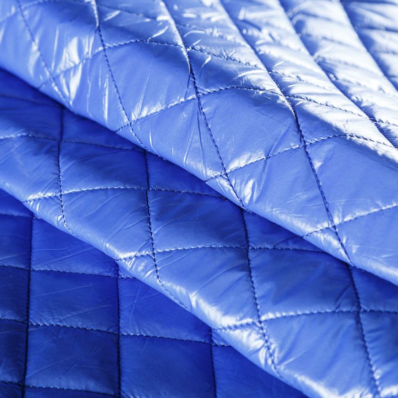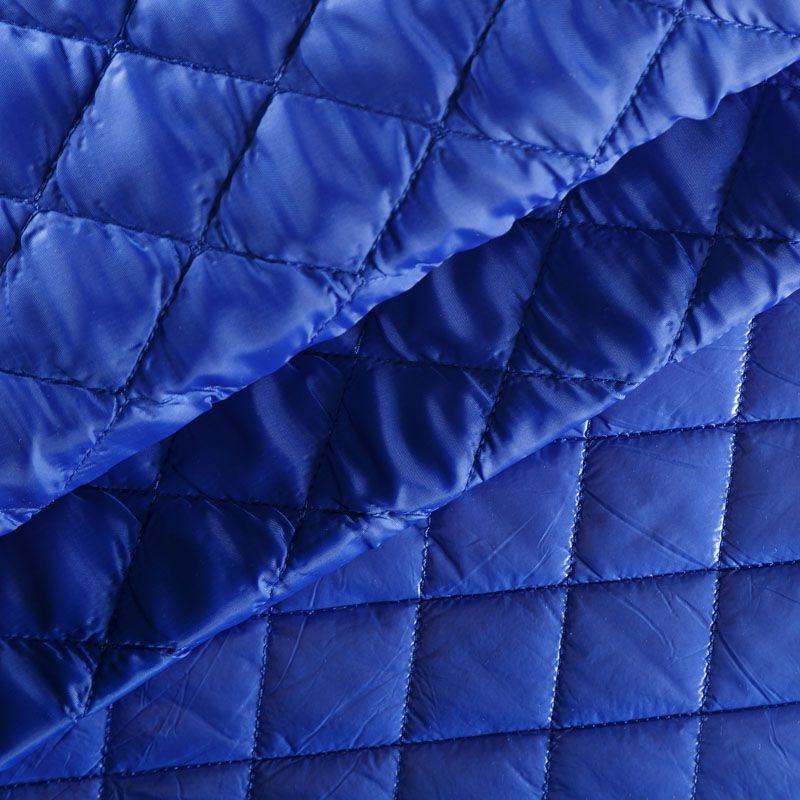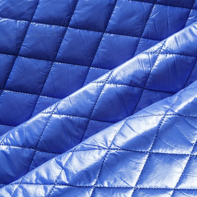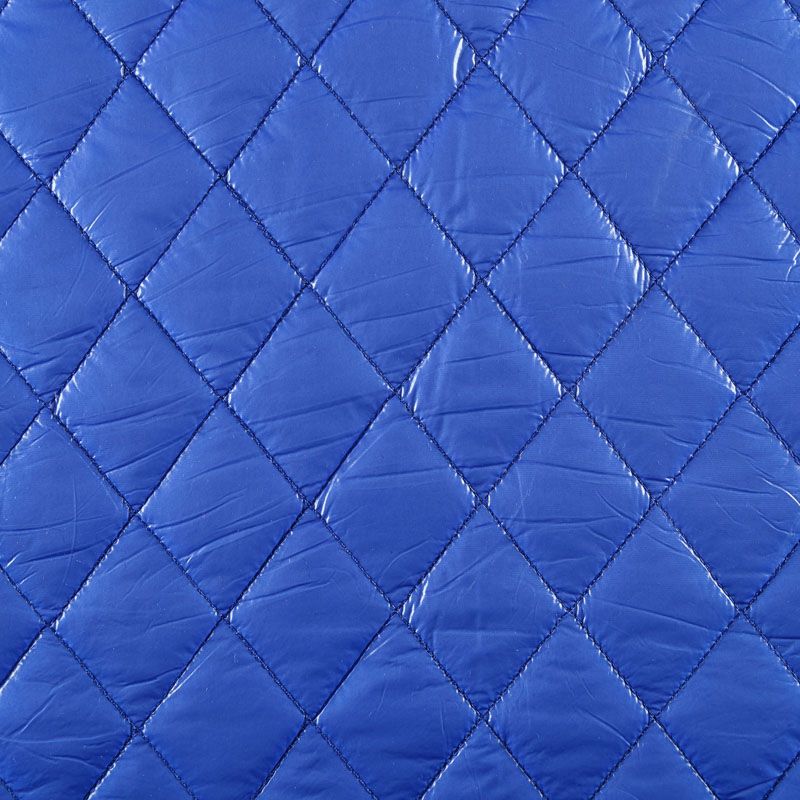 Трехслойная курточная стежка ярко-синего цвета, простеганная не крупными ромбами. Верхний  слой - полиэстер, по качеству напоминающий болонь, средний слой - синтепон, нижний слой - подкладочная ткань в тон лицевой. Очень мягкая и легкая, пластичная, хорошо драпируется. Прекрасно подойдет для  пошива легких пальто, курток, жилетов, накидок-кейпов, объемных сумок.