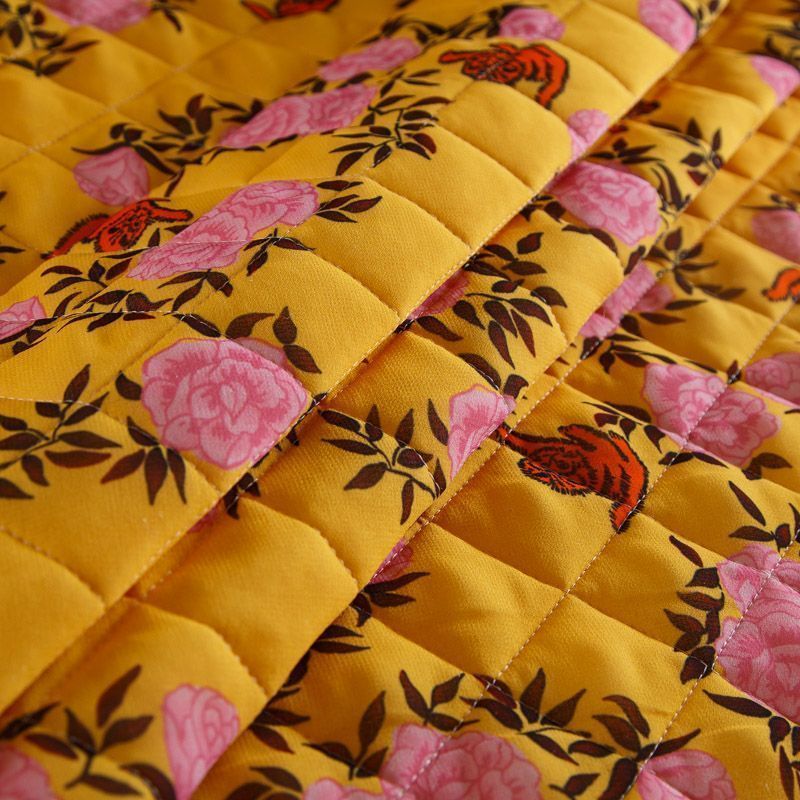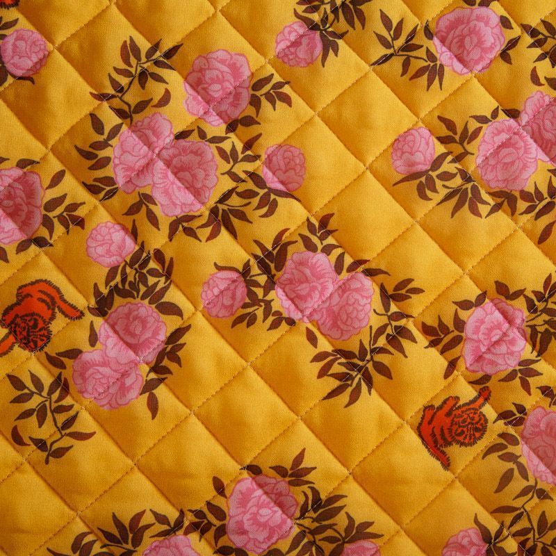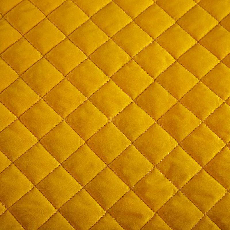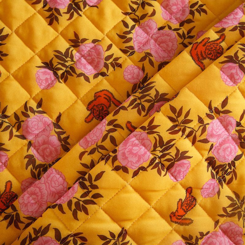 Итальянская трехслойная курточная ткань насыщенного желтого цвета с ярким принтом, простеганная ромбами. Нижний слой - подкладочная ткань желтого цвета, средний слой - синтепон, верхний - принтованный креп-шифон. Очень мягкая и легкая, пластичная, хорошо драпируется. Прекрасно подойдет для  пошива легких пальто, бомберов, парки, курток, жилетов, накидок-кейпов, объемных сумок.