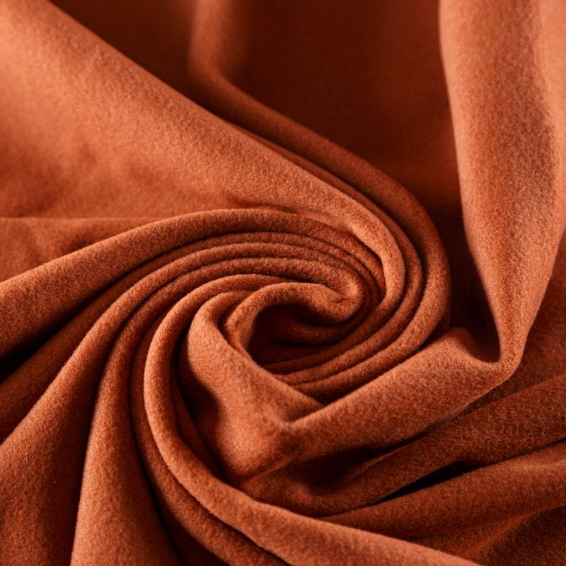 Пальтовая итальянская шерсть в темно-карамельном оттенке. Ткань плотная, достаточно теплая, комфортная для одежды на сезон осень-зима. Полотно имеет короткий шлифованный ворс. Мягкое и нежное на ощупь, не толстое и не тяжелое, хорошо держит форму. Прекрасно подойдет для пошива женских пальто, теплых костюмов, кейпов, мягких бомберов, жилетов и головных уборов.