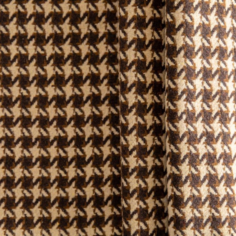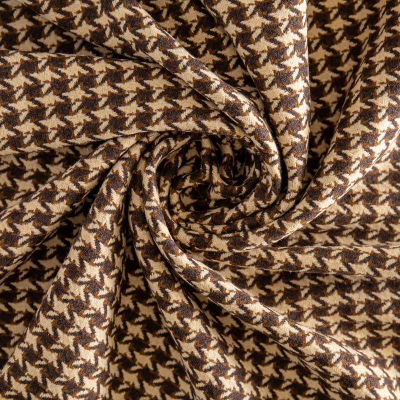Плотная пальтовая ткань с добавлением вискозы песочного оттенка в коричневую куриную лапку, мягкая и приятная на ощупь, формоустойчива, хорошо драпируется. Ткань отлично подойдет для пошива пальто, теплых костюмов, юбки, шорт, жакета, кейпа, жилета.