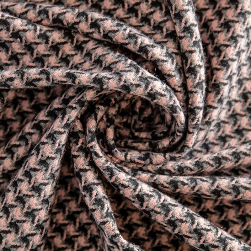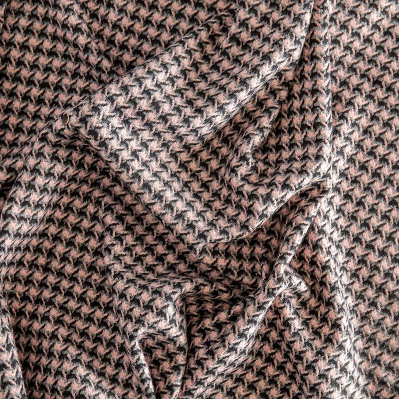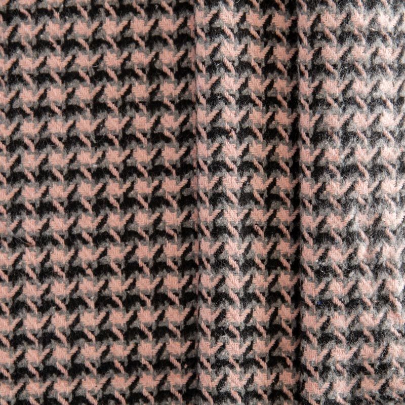 Плотная пальтовая ткань с добавлением вискозы розового оттенка в черно-серую куриную лапку, мягкая и приятная на ощупь, формоустойчива, хорошо драпируется. Ткань отлично подойдет для пошива пальто, теплых костюмов, юбки, шорт, жакета, кейпа, жилета.