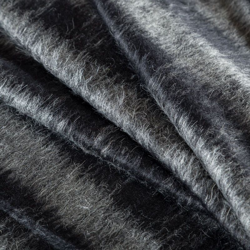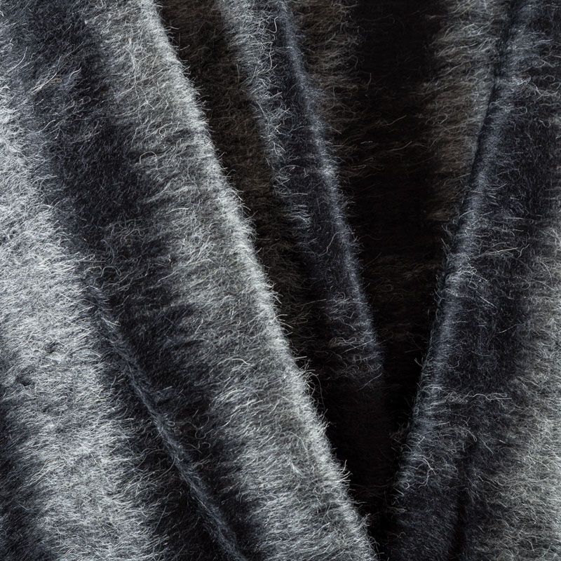 Итальянская шерсть с добавлением мохера в горизонтальную серо-черную полоску. Полотно с густым направленным ворсом, среднем плотности, пластичное, мягкое, приятное на ощупь. Подойдет для пошива пальто, кардигана, бомбера, пончо.
