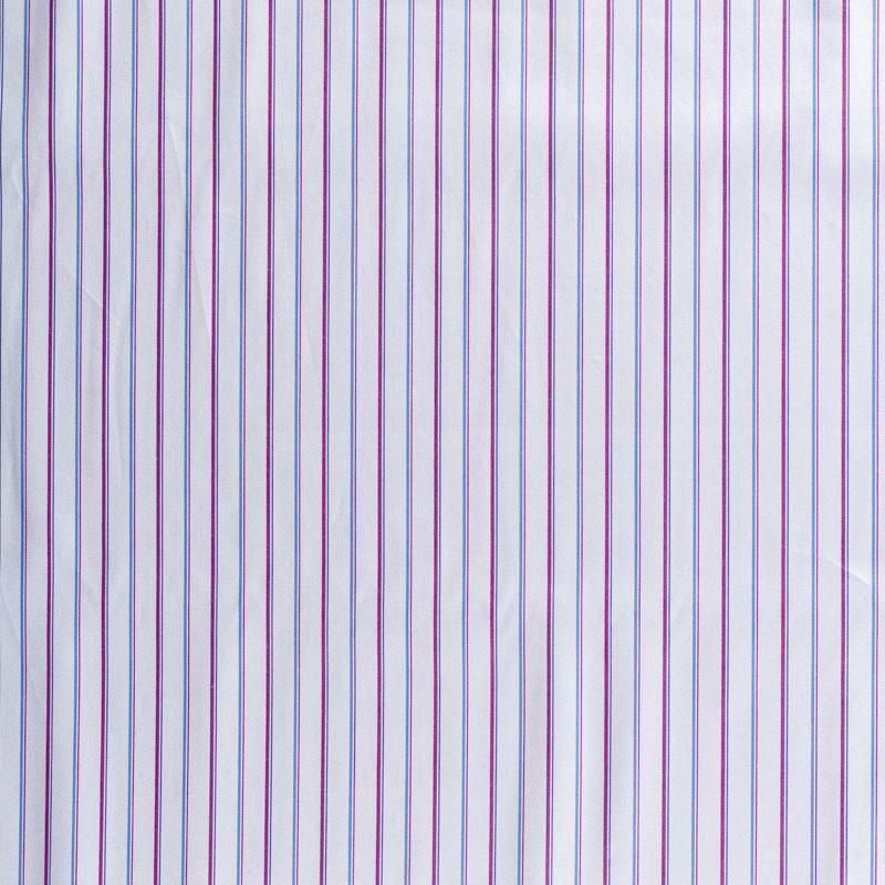 Итальянский плательно-рубашечный хлопок в тонкую полоску винного и голубого цвета. Ткань мягкая, лёгкая, непрозрачная, пластичная и приятная к телу, хорошо драпируется, имеет гладкую матовую поверхность и сатиновое плетение. Прекрасно подойдет как для пошива платья-рубашки, сарафана, платьев различных фасонов, туники, топа, летнего костюма, комбинезона, мужской и детской одежды.