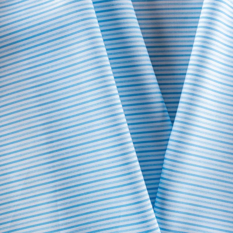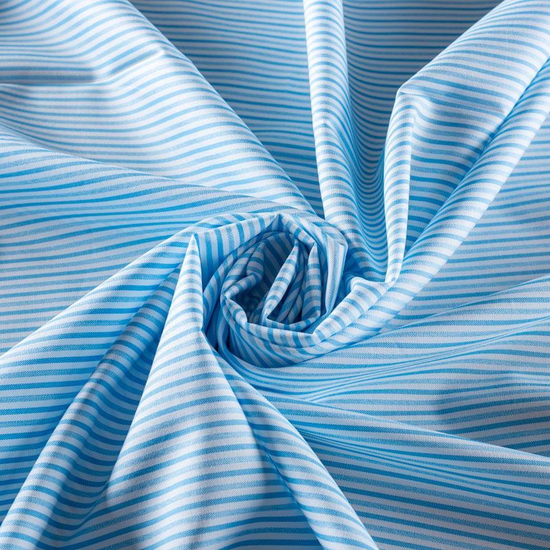 Итальянский плательно-рубашечный хлопок в тонкую полоску в голубых оттенках. Ткань мягкая, лёгкая, непрозрачная, пластичная и приятная к телу, хорошо драпируется, имеет гладкую матовую поверхность и сатиновое плетение. Прекрасно подойдет как для пошива платья-рубашки, сарафана, платьев различных фасонов, туники, топа, летнего костюма, комбинезона, мужской и детской одежды.