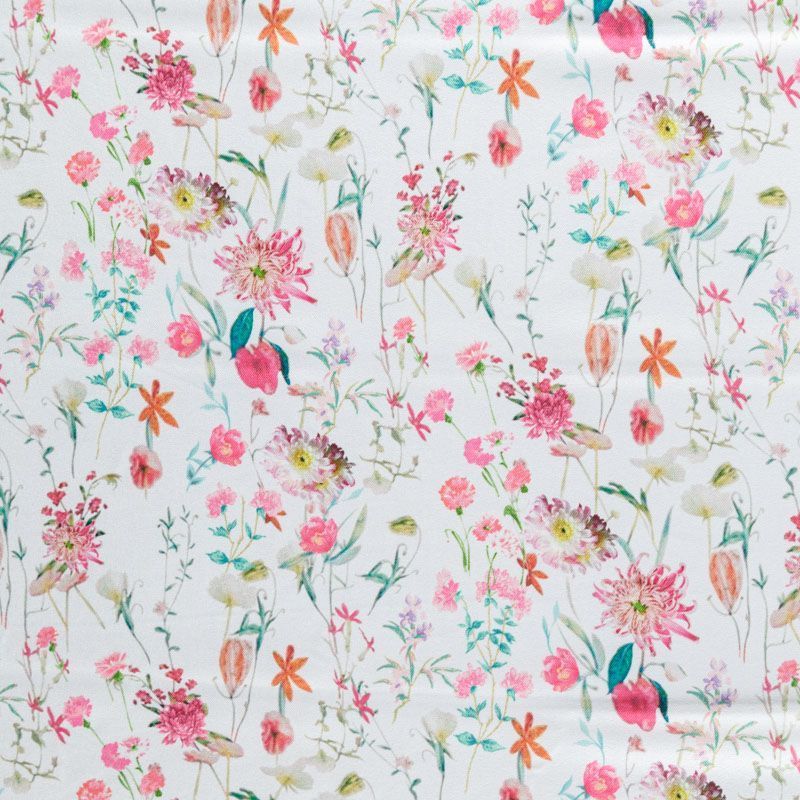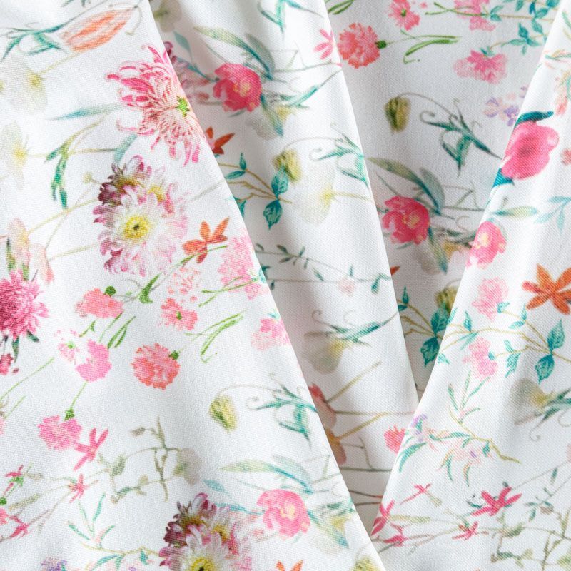 Плательно-блузочная ткань в молочном оттенке с цветочным принтом. Ткань мягкая, лёгкая, непрозрачная, пластичная и приятная к телу, хорошо драпируется, имеет гладкую матовую поверхность. Прекрасно подойдет как для пошива платья, сарафана, блузки, туники, топа, летнего костюма, комбинезона.