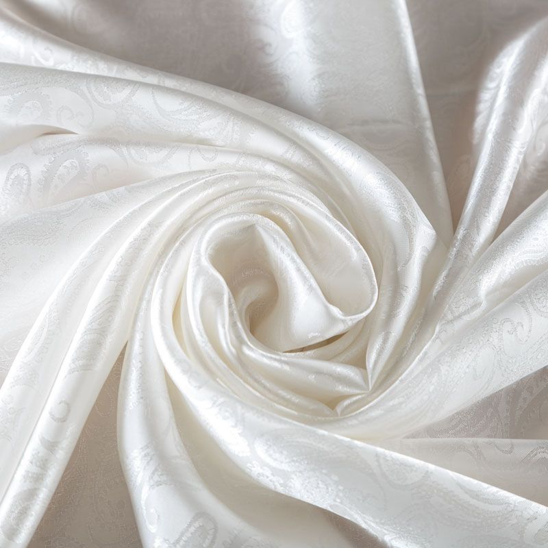 Итальянская вискозная подкладочная ткань молочного оттенка с жаккардовым узором пейсли и красивым лоском. Полотно средней плотности, легкое, не просвечивает, хорошо скользит, не тянется. Подойдет для изготовления таких изделий, как пальто, костюмы, куртка, шуба, платье, жакет.