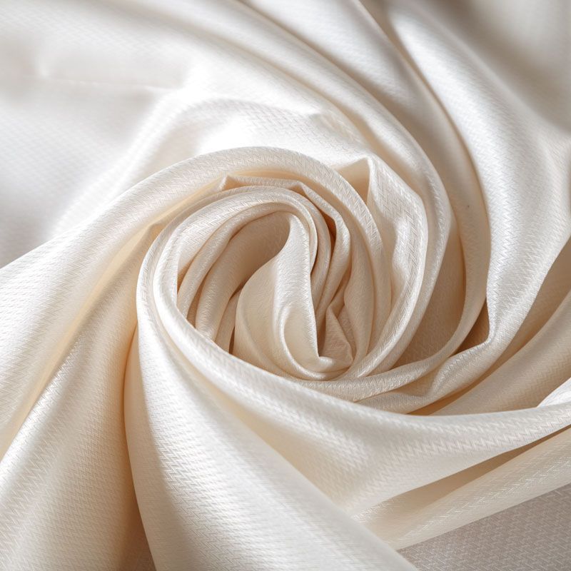 Смесовая подкладочная ткань молочного оттенка с жаккардовым геометрическим узором и красивым лоском. Полотно средней плотности, легкое, не просвечивает, хорошо скользит, не тянется. Подойдет для изготовления таких изделий, как пальто, костюмы, куртка, шуба, платье, жакет.