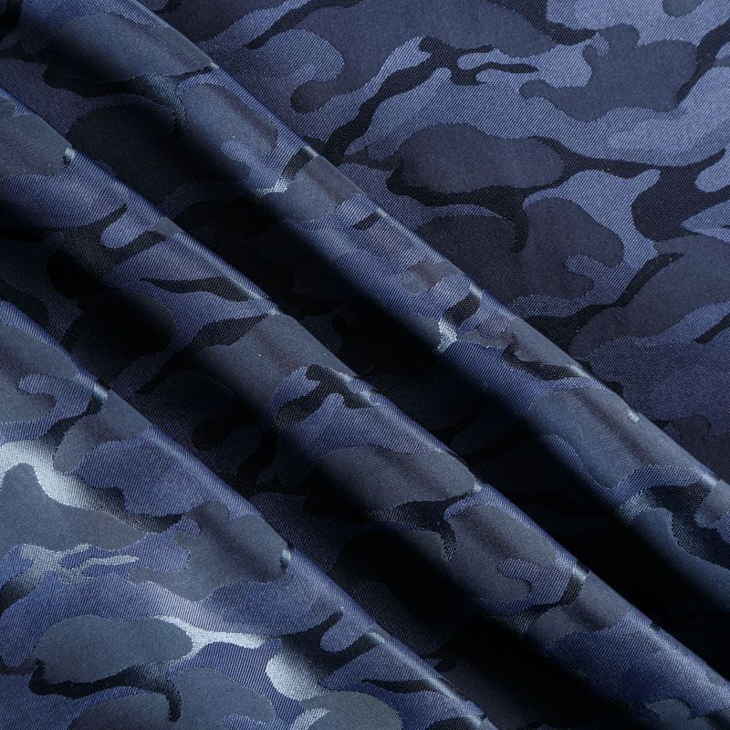 Смесовая подкладочная ткань синего оттенка с жаккардовым камуфляжным узором и красивым лоском. Полотно средней плотности, легкое, не просвечивает, хорошо скользит, не тянется. Подойдет для изготовления таких изделий, как пальто, костюмы, куртка, шуба, платье, жакет.