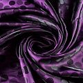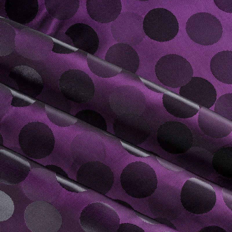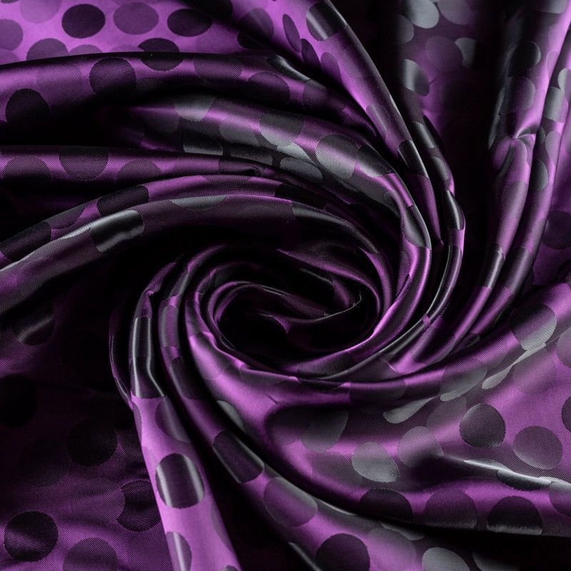 Подкладочная ткань легкая, с жаккардовым крупным "горохом", лилового оттенка, с красивым блеском. Не просвечивает, хорошо скользит. Подойдет для изготовления таких изделий, как пальто, костюмы, куртка, шуба, платье, жакет.