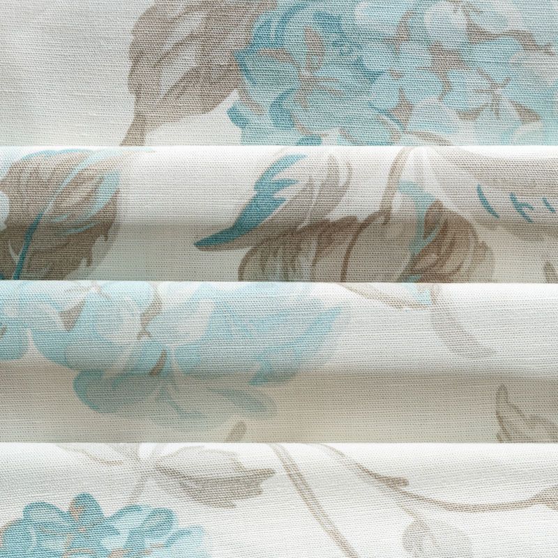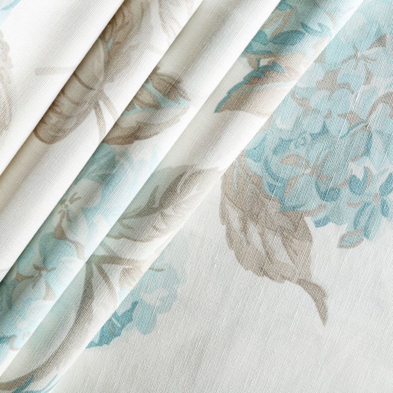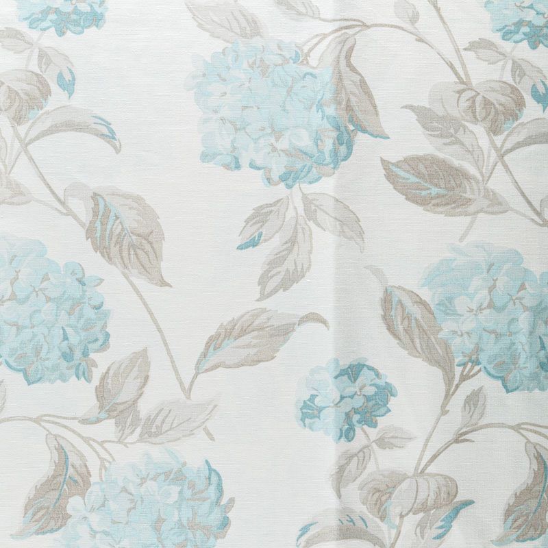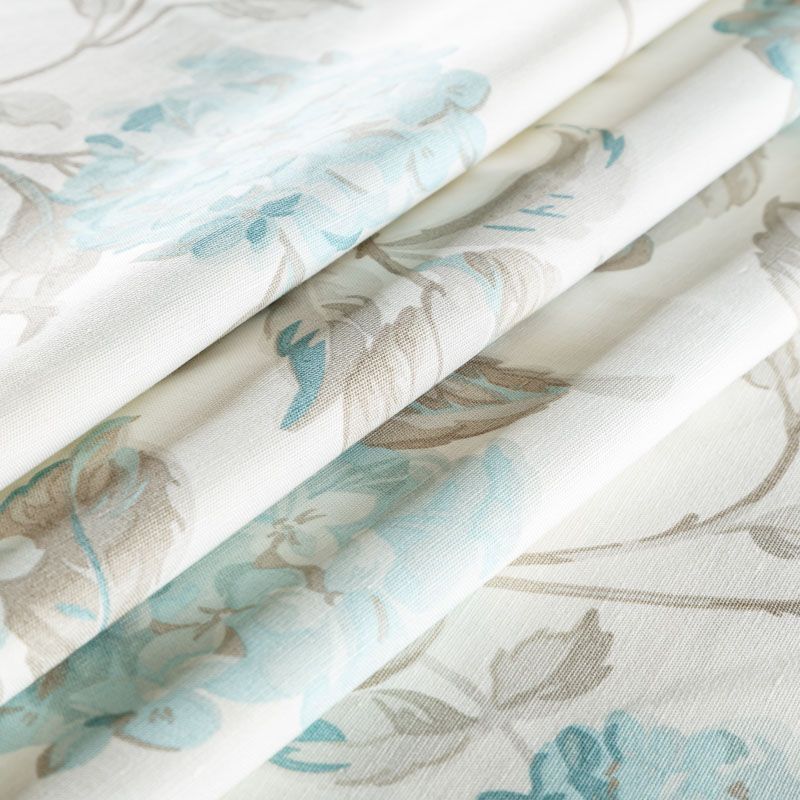 Хлопковая текстурированная портьерная ткань с красивыми ветками гортензий в серо-бирюзовой гамме на молочном фоне. Ткань средней плотности, без блеска, хорошо драпируется, имеет полонтяное переплетение. Можно использовать для пошива портьер, римской шторы, салфеток, столового белья, подушек, покрывал и других предметов текстильного интерьера.