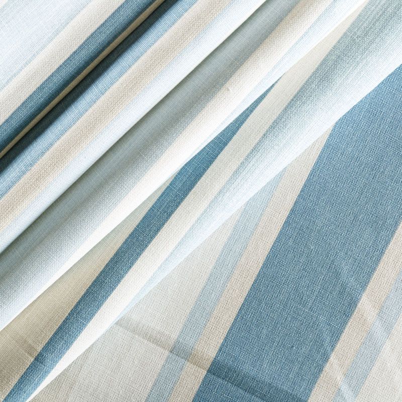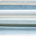 Матовая фактурная портьерная ткань в полоску, которая расположена вдоль кромки. Представлена в бежево-голубой палитре. Ткань средней плотности, без блеска, хорошо драпируется, имеет полонтяное переплетение. Прекрасно впишется в самые разные стилевые направления (прованс, кантри). Можно использовать для пошива портьер, римской шторы, салфеток, столового белья, подушек, покрывал и других предметов текстильного интерьера.