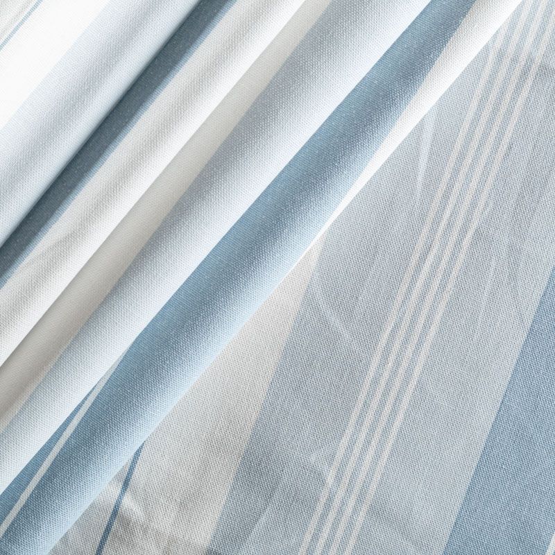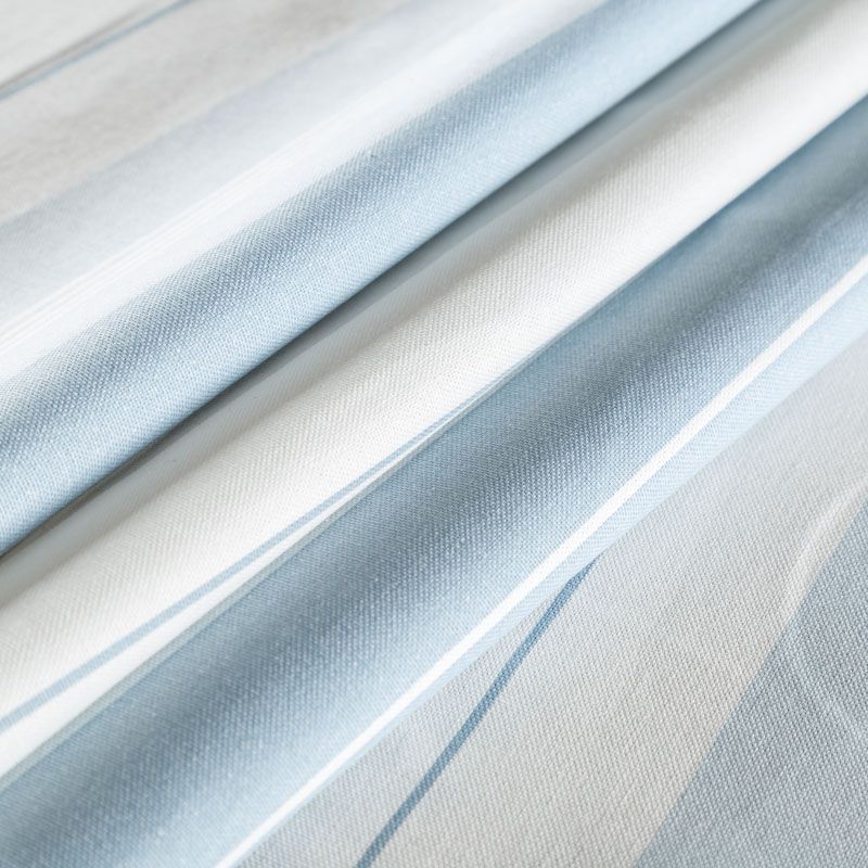 Матовая фактурная портьерная ткань в полоску, которая расположена вдоль кромки. Представлена в серо-голубой палитре. Ткань средней плотности, без блеска, хорошо драпируется, имеет полонтяное переплетение. Прекрасно впишется в самые разные стилевые направления (прованс, кантри). Можно использовать для пошива портьер, римской шторы, салфеток, столового белья, подушек, покрывал и других предметов текстильного интерьера.