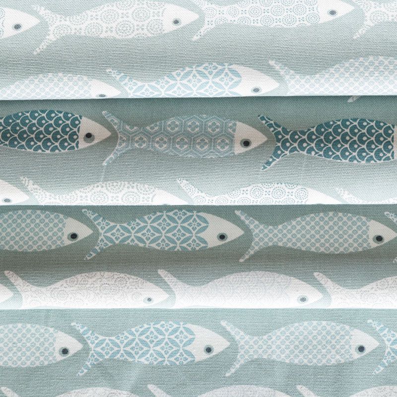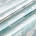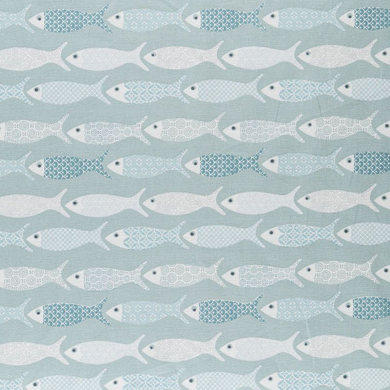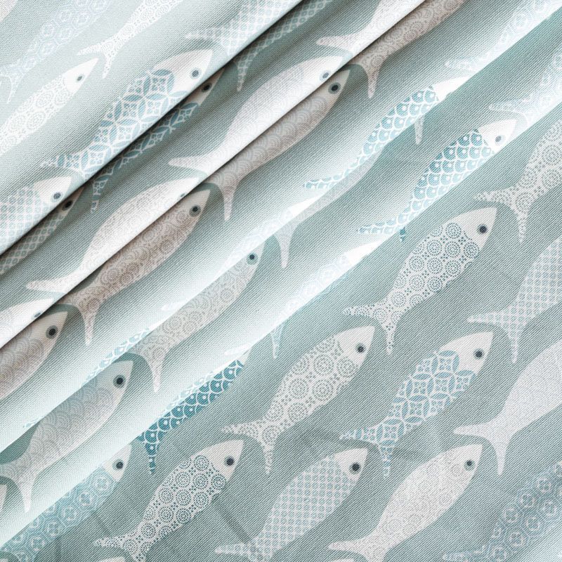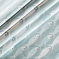 Матовая фактурная портьерная ткань зеленовато-голубого оттенка с монохромными рыбками. Ткань средней плотности, без блеска, хорошо драпируется, имеет полонтяное переплетение. Прекрасно впишется в самые разные стилевые направления (прованс, кантри). Можно использовать для пошива портьер, римской шторы, салфеток, столового белья, подушек, покрывал и других предметов текстильного интерьера.
