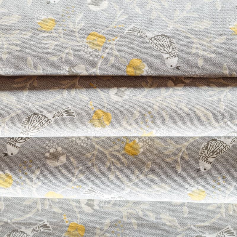 Хлопковая портьерная ткань от английского производителя. На  текстурированной серой основе наснесен принт в виде стилизованных птиц и цветов. Ткань средней плотности, прекрасно держит форму, драпируется в устойчивые складки. Подойдет для классических портьер, римских штор, покрывал, подушек, скатертей, салфеток и других элементов текстильного интерьера как в самостоятельном исполнении, так и качестве компаньона к однотонным варинтам.