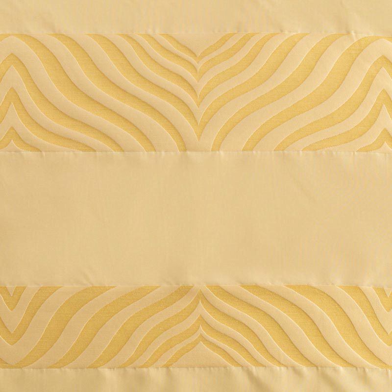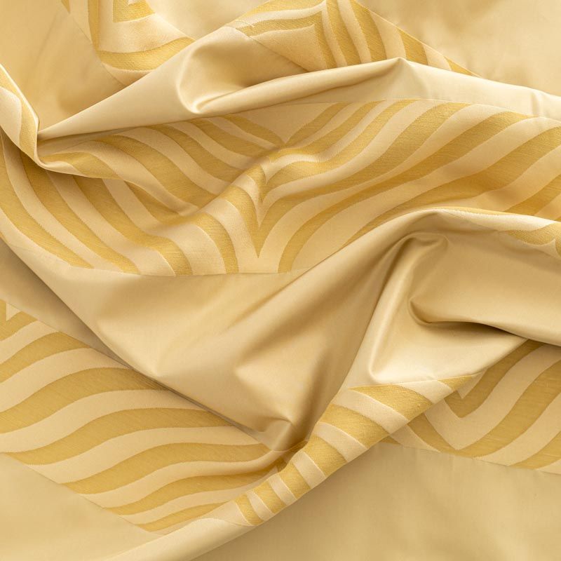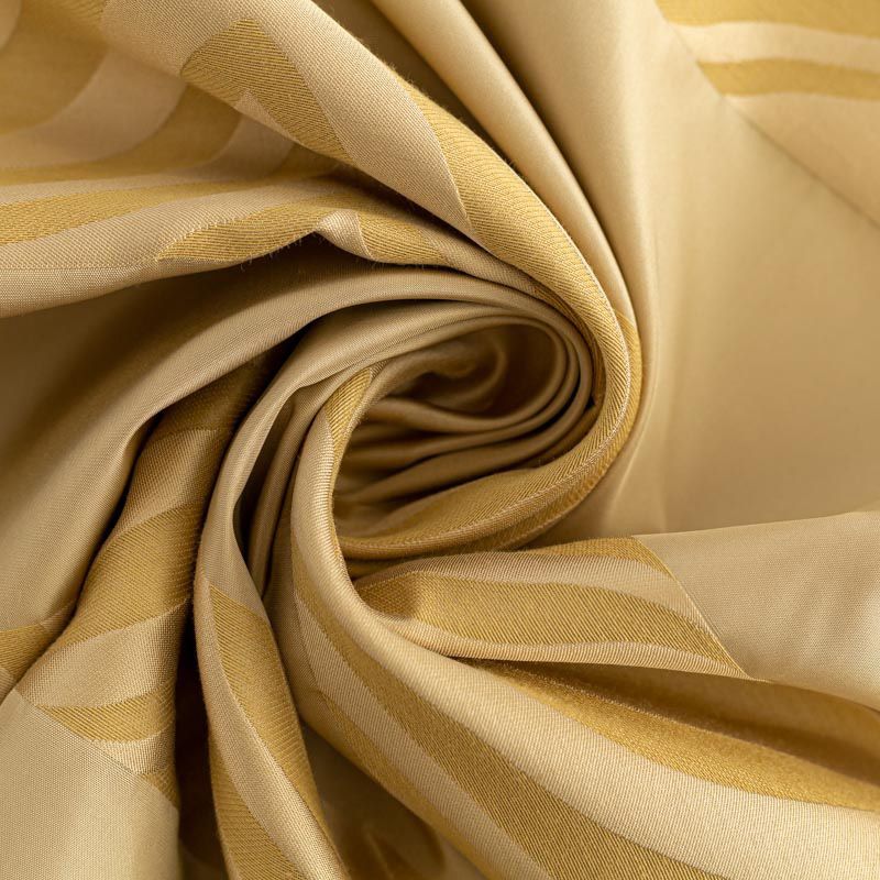 По своей структуре шелковые портьерные ткани являются мягким и красивым материалом, способным отражать свет. Изделия из шелка удивительно переливаются и блестят, придавая интерьеру помещения особую атмосферу и вид. Такие портьерные ткани лучше всего применять для создания покрывал, наволочек, штор, легких, воздушных и светлых – они отлично подойдут для затемненных мест либо закрытых окон. Ткань имеет вертикальные полосы в разных оттенках золотисто-бежевого цвета, а так же сочетает в себе чередование полос матовой и блестящей текстур.