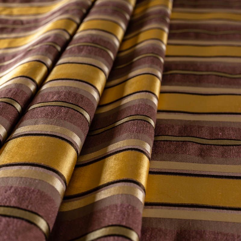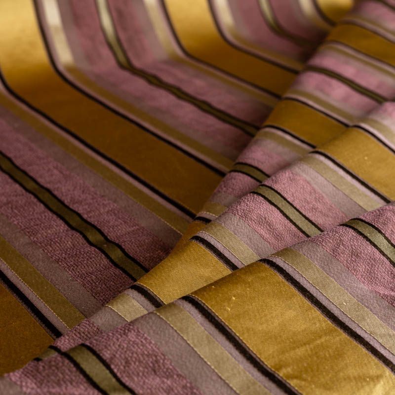 По своей структуре шелковые портьерные ткани являются мягким и красивым материалом, способным отражать свет. Изделия из шелка удивительно переливаются и блестят, придавая интерьеру помещения особую атмосферу и вид. Такие портьерные ткани лучше всего применять для создания покрывал, наволочек, штор, легких, воздушных и светлых. Ткань имеет вертикальные полосы в разных оттенках золотистого цвета, а так же сочетает в себе чередование полос матовой и блестящей текстур.