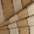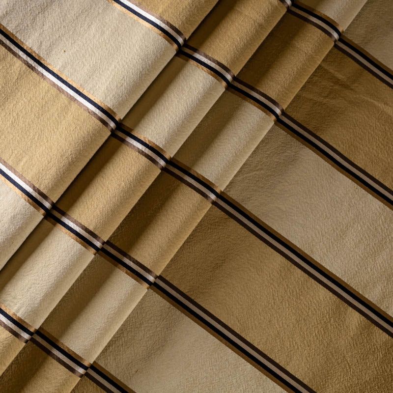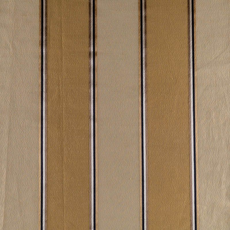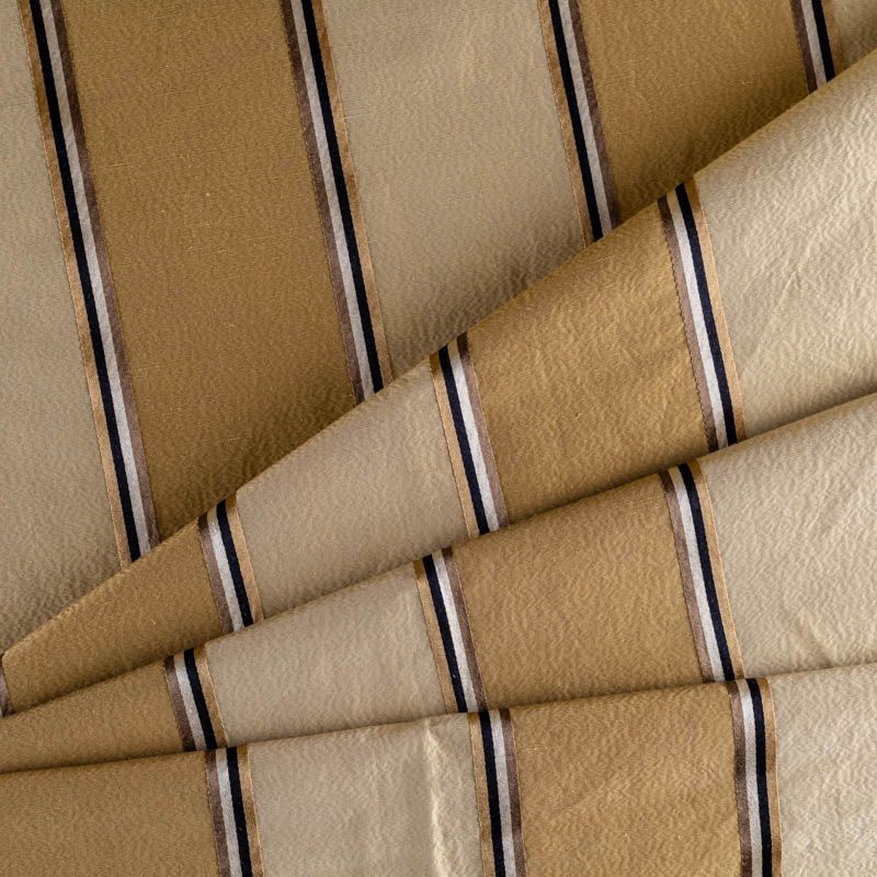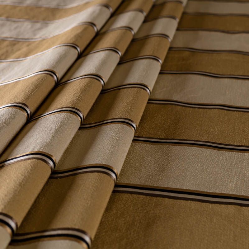 По своей структуре шелковые портьерные ткани являются мягким и красивым материалом, способным отражать свет. Изделия из шелка удивительно переливаются и блестят, придавая интерьеру помещения особую атмосферу и вид. Такие портьерные ткани лучше всего применять для создания покрывал, наволочек, штор, легких, воздушных и светлых. Ткань имеет вертикальные полосы в разных оттенках золотистого цвета, а так же сочетает в себе чередование полос матовой и блестящей текстур.