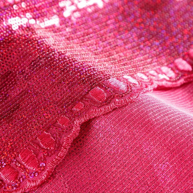 Эластичная сетка розового оттенка по всей поверхности которой расположены глянцевые пайетки. Ткань очень хорошо драпируется, красиво переливается, имеет глянцевый блеск, пластичная, полоски расположены вдоль кромок, которые обработаны вышитым фигурным фестоном, набирается объемом,  Пайетки — идеальный материал для праздников и вечеринок. Из них получится эффектное платье, жакет, боди, туника, юбка или комбинезон.