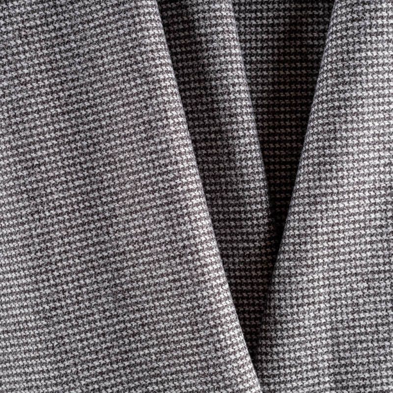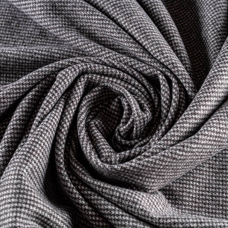 Трикотаж средней толщины, хорошо тянется. Мелкий ненавязчивый узор "гусиная лапка" образуется переплетением черных и белых нитей. Ткань не сухая, мягкая, но плотная, не просвечивает, теплая, хорошо драпируется. Отлично подойдет для пошива легкой верхней одежды, жакетов, костюмов, юбок.