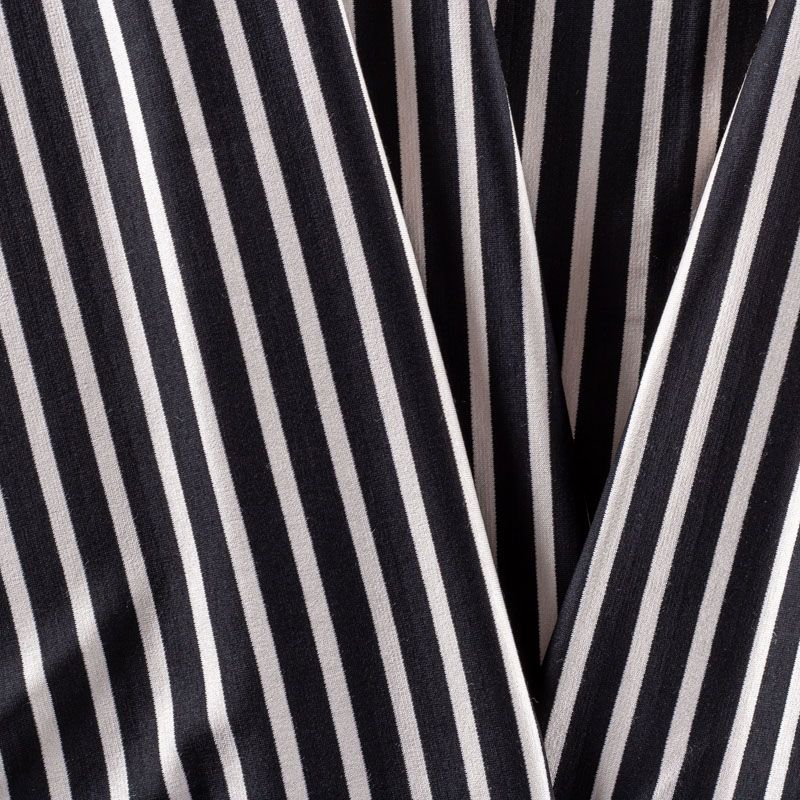 Итальянский трикотаж "пенье" из вискозы в черно-бежевую горизонтальную полоску. Поверхность гладкая и матовая. Ткань очень плотная за счет плетения, пластичная, хорошо тянется, не просвечивает. Прекрасно подойдет для пошива лонгслива, футболки, кардигана, платья или юбки в спортивном стиле.