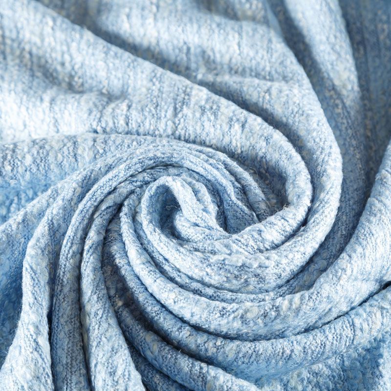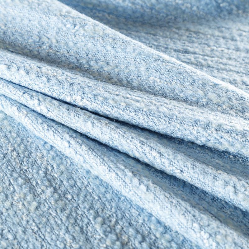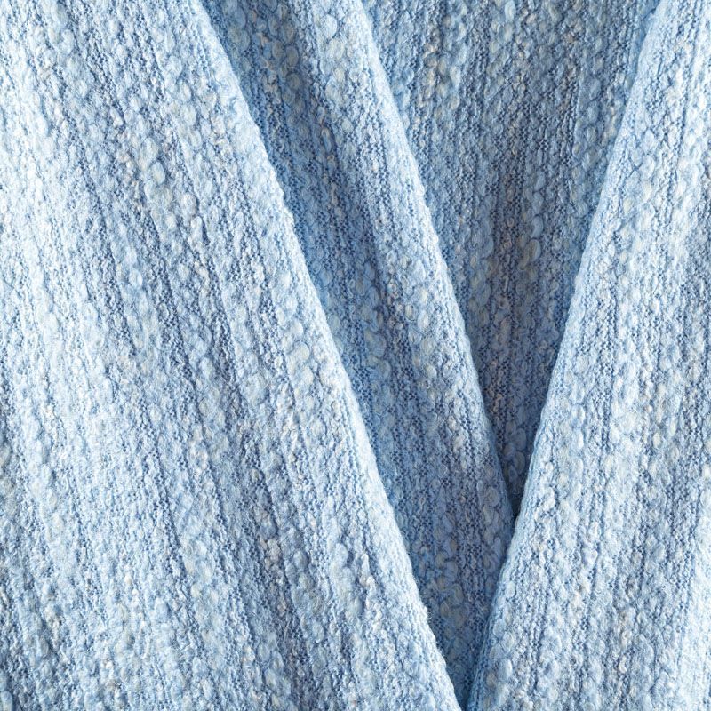 Букле на трикотажной основе с сочетанием голубых и молочно-белых нитей. Материал пластичный, плотный, плетение немного тянется. Подойдет для пошива облегченного пальто, теплого кардигана, юбки, свитера, пончо.