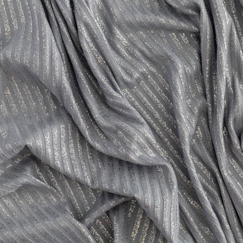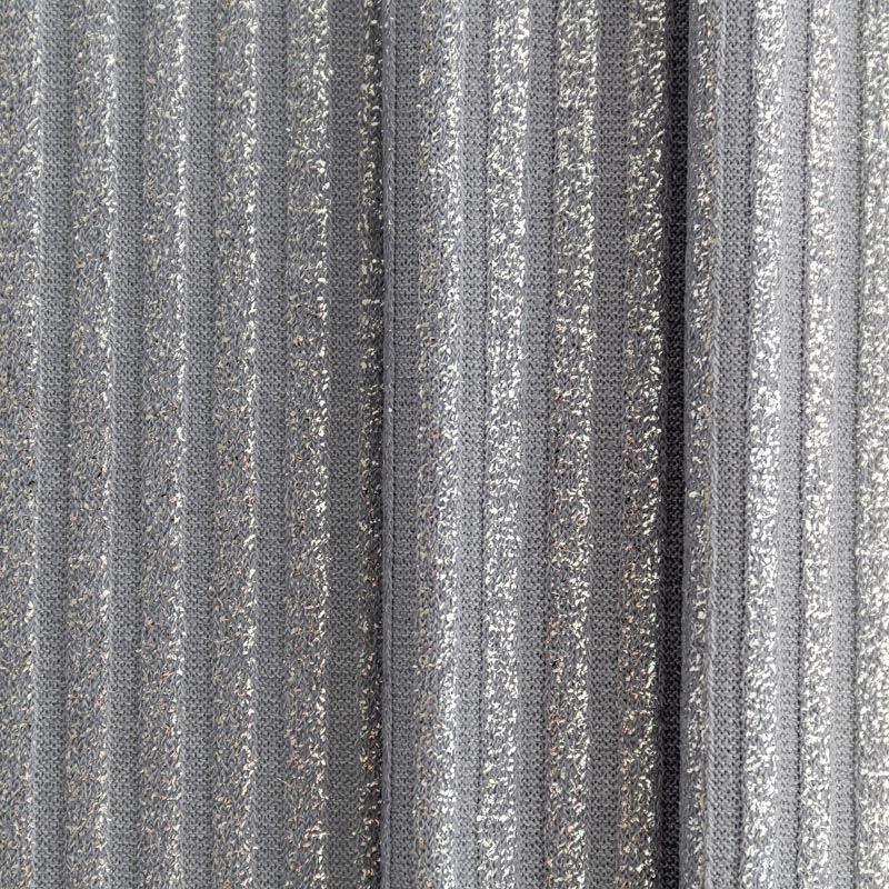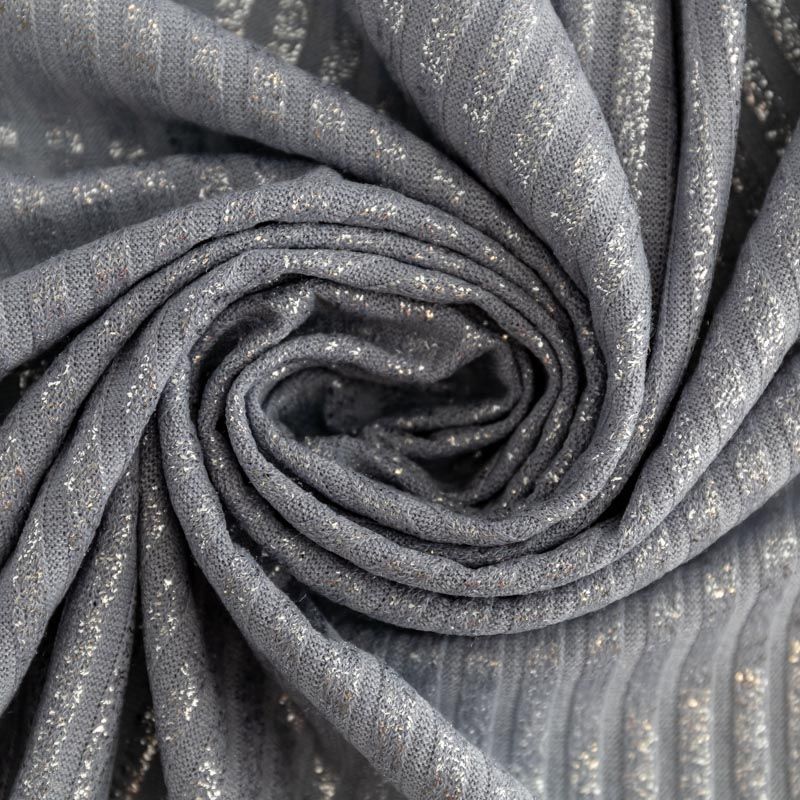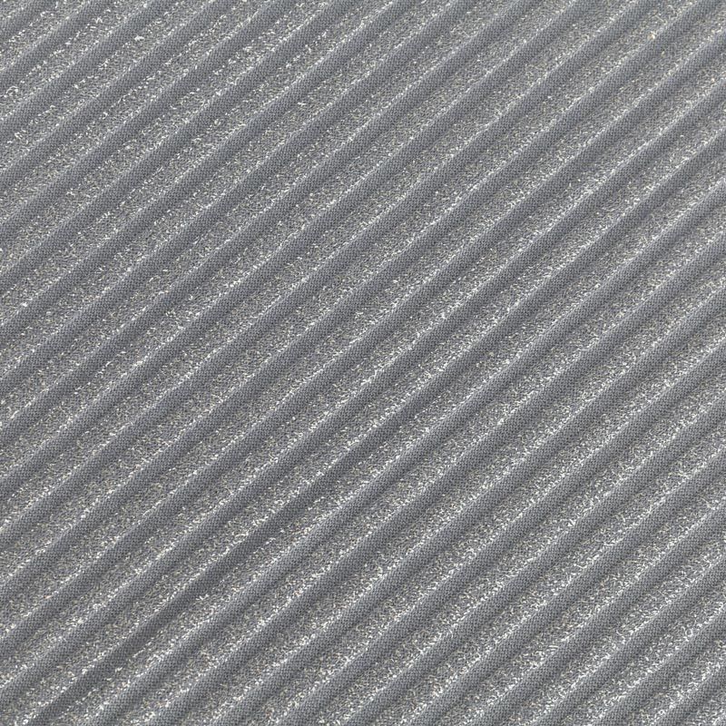 Трикотаж-лапша средней плотности, с высокой степенью эластичности, поверхность рельефная за счет эффекта резинки и мерцающая за счет металлизированного напыления. С изнанки трикотаж гладкий, комфортный, подходит для использования без подклада. Сшить из такого полотна можно водолазки, платья, топы, юбки, комплекты, нарядные изделия. Направление полос - вдоль линии кромки.