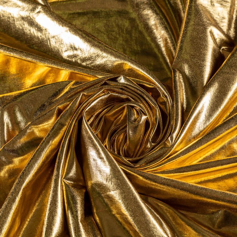 Эффектное трикотажное полотно с золотым металлическим блеском. Материал очень пластичный, образует струящиеся мягкие складки, отлично тянется, не просвечивает, не мнется. Изнаночная сторона матовая, приятная на ощупь. Идеальный выбор для нарядных моделей, гимнастических и танцевальных костюмов.
