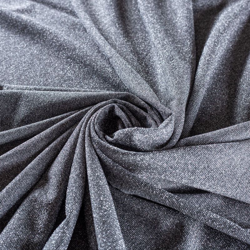 Итальянский вискозный трикотаж серого оттенка с добавлением серебристой люрексной нити. Поверхность шероховатая на ощупь, ткань очень плотная за счет плетения, пластичная, хорошо тянется, не просвечивает. Прекрасно подойдет для пошива лонгслива, гольфа, футболки, кардигана, платья или юбки в спортивном стиле.