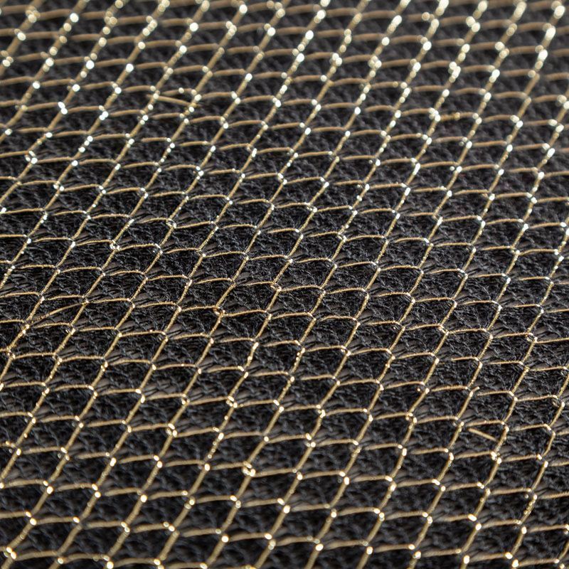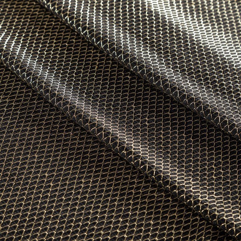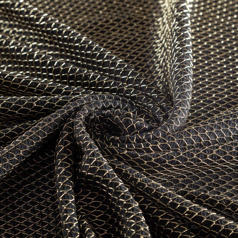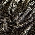 Тонкий ажурный вязаный трикотаж черного цвета декорирован золотистой люрексовой нитью, которая имитирует сетку. Ткань легкая, мягкая, не колется, прозрачная. Идеально подойдет для пошива водолазки, свитера, кардигана, а также для шарфа, снуда.