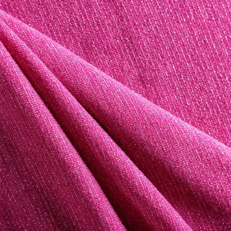 Мягкое и эффектное трикотажное полотно с металлизированным деликатным блеском. Структура полотна плотная, легко растяжимая, эластичная. С лицевой стороны поверхность ткани слегка шероховатая на ощупь, с изнанки трикотаж гладкий, комфортный, подходит для использования без подклада. Отлично пододет для пошива водолазки, платья, топа, леггинсов, спортивных купальников, нарядных изделий.