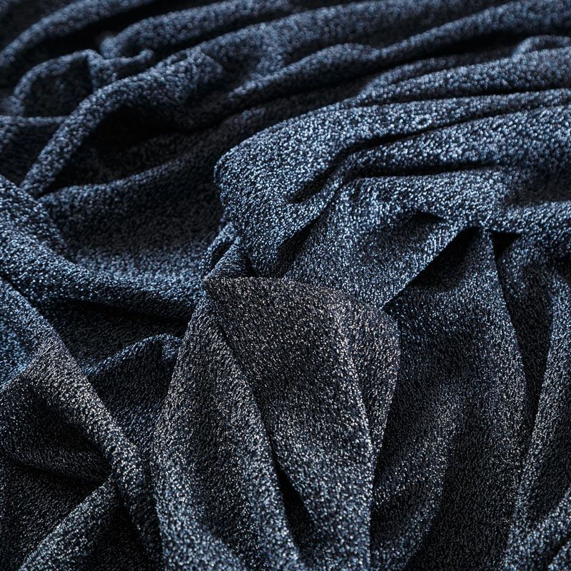 Трикотажное полотно с металлизированным блеском и мерцанием. Люрексные нити голубого оттенка вплетены в структуру полотна и создают объемный "вспененный" эффект, при этом изнанка гладкая и ровная. Ткань очень приятная к телу, не колется, не просвечивается, очень эластичная, отлично драпируется и ниспадает, красиво ляжет по фигуре. Идеальный вариант для пошива вечерних и нарядных платьев облегающего и свободного силуэта, топов, комбинезона, юбки, широких брюк, туник, кардиганов, накидок.