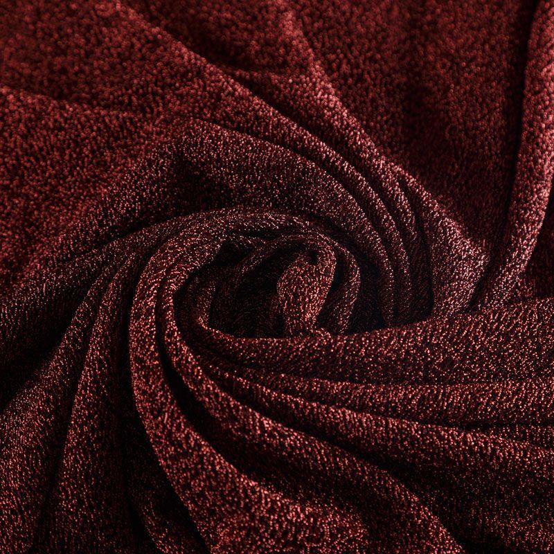 Трикотажное полотно с металлизированным блеском и мерцанием. Люрексные нити бордового оттенка вплетены в структуру полотна и создают объемный "вспененный" эффект, при этом изнанка гладкая и ровная. Ткань очень приятная к телу, не колется, не просвечивается, очень эластичная, отлично драпируется и ниспадает, красиво ляжет по фигуре. Идеальный вариант для пошива вечерних и нарядных платьев облегающего силуэта, топов, комбинезона, юбки, широких брюк, туник, кардиганов, накидок.
