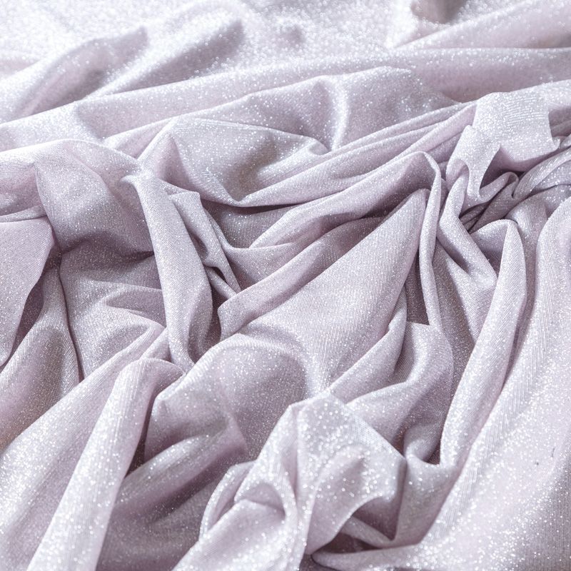 Трикотажное полотно средней плотности с добавлением серебристой люрексной нити. Поверхность шероховатая на ощупь, ткань пластичная, хорошо тянется, не просвечивает. Прекрасно подойдет для пошива лонгслива, гольфа, футболки, кардигана, жакета, платья или юбки в спортивном стиле.