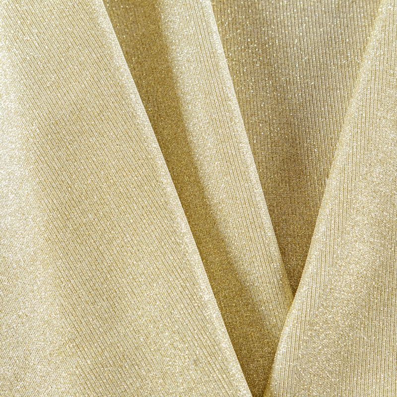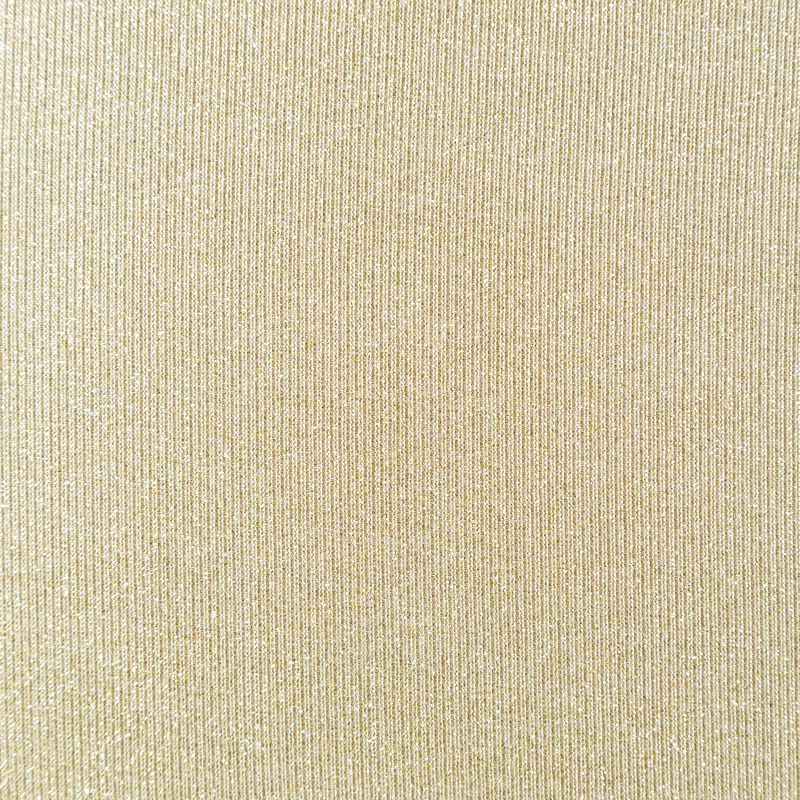 Трикотажное полотно средней плотности с добавлением золотистой люрексной нити. Поверхность шероховатая на ощупь, ткань пластичная, хорошо тянется, не просвечивает. Прекрасно подойдет для пошива лонгслива, гольфа, футболки, кардигана, жакета, платья или юбки в спортивном стиле.