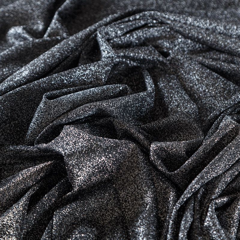 Трикотажное полотно с металлизированным блеском и  мерцанием. Люрексные нити вплетены в структуру полотна и создают объемный "вспененный" эффект, при этом изнанка гладкая и ровная. Ткань очень приятная к телу, не колется, не просвечивается, очень эластичная, отлично драпируется и ниспадает, красиво ляжет по фигуре. Идеальный вариант для пошива вечерних и нарядных платьев облегающего и свободного силуэта, топов, комбинезона, юбки, широких брюк, туник, кардиганов, накидок.