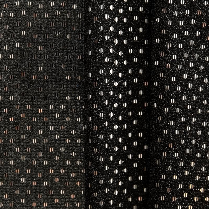 Трикотаж черного цвета с серебристой люрексовой нитью и мелкими пайетками. Мягкая и эластичная ткань, великолепно драпируется и красиво облегает. Тонкий, просвечивает, требуется подклад. Прекрасно подходит для изделий по фигуре, а также нарядов с мягкими складками. Трикотаж можно использовать для вечерних образов — платья, блузки, топы, кофточки и боди и для пошива танцевальных и сценических костюмов.