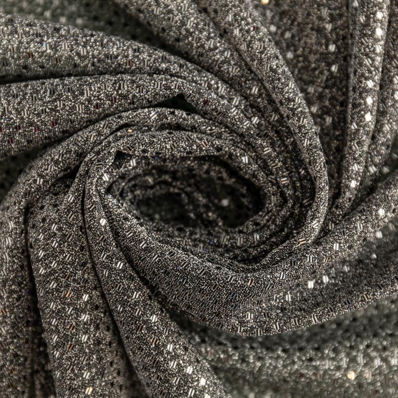 Трикотаж серебристого цвета с люрексовой нитью и мелкими пайетками. Мягкая и эластичная ткань, великолепно драпируется и красиво облегает. Тонкий, просвечивает, требуется подклад. Прекрасно подходит для изделий по фигуре, а также нарядов с мягкими складками. Трикотаж можно использовать для вечерних образов — платья, блузки, топы, кофточки и боди и для пошива танцевальных и сценических костюмов.