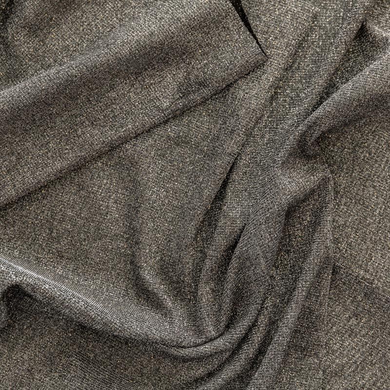 Мягкое и эффектное трикотажное полотно с металлизированным напылением. Структура полотна плотная, легко растяжимая, эластичная. С лицевой стороны поверхность ткани  слегка шероховатая на ощупь, характеризуется заметным блеском «металлик». С изнанки трикотаж гладкий, комфортный, подходит для использования без подклада. Отлично пододет для пошива водолазки, платья, топа, леггинсов, спортивных купальников, нарядных изделий.