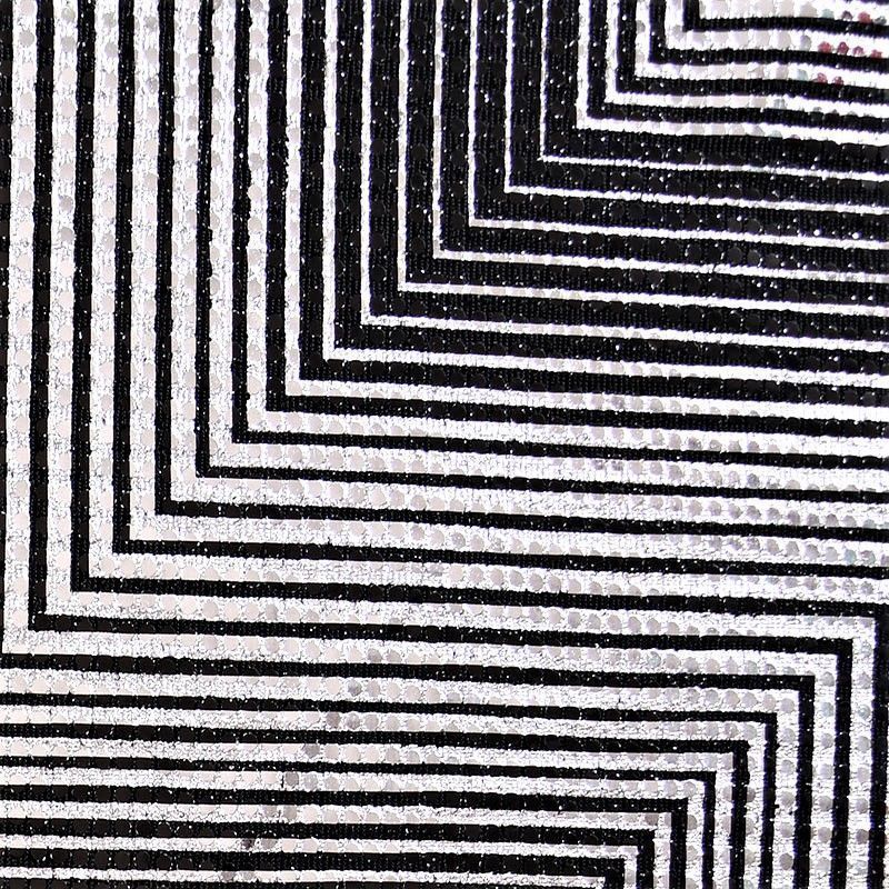 Трикотажное черное полотно серебристым геометрическим узором и деликатными прозрачными круглыми пайетками. Декор накатан на основу, поэтому будет комфортен в носке. Ткань пластичная, прекрасно драпируется и укладывается в складки, легко садится по фигуре за счёт основы с эластаном, не прозрачная, позволит шить изделия без подклада. Идеально подойдет для пошива нарядных вечерних образов: платья, юбки, топа, туники, широких брюк, жакета, кардигана.