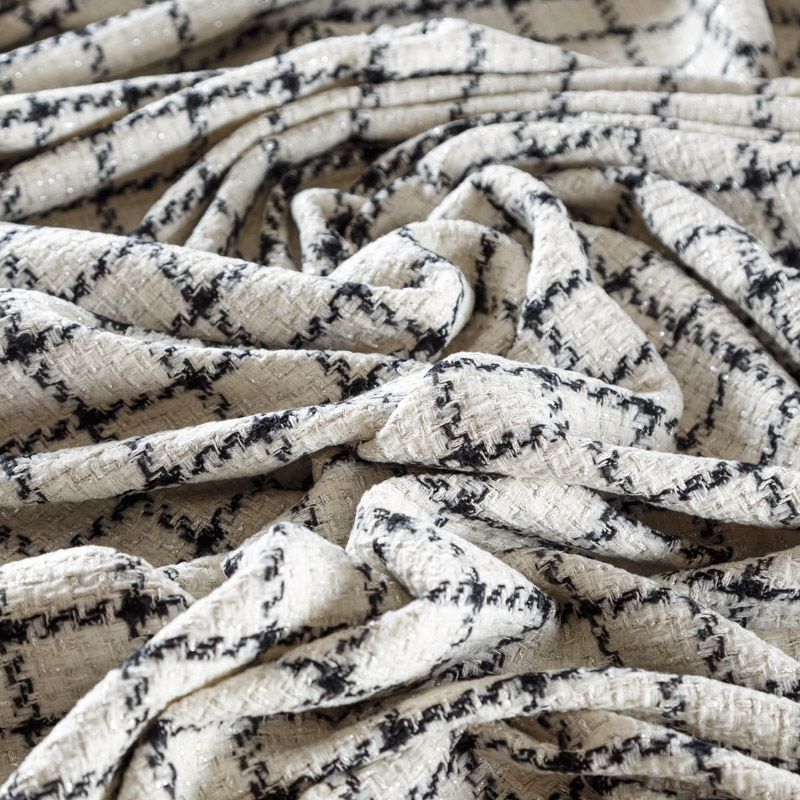 Фактурная твидовая ткань с добавлением шерсти и хлопка. Ткань мягкая, пластичная, приятная на ощупь. Хорошо драпируется и образует формоустойчивые складки. Твид отлично подходит для пошива костюмов, пальто, пиджаков, шорт и курток, юбок, жилетов, головных уборов в классическом стиле.
