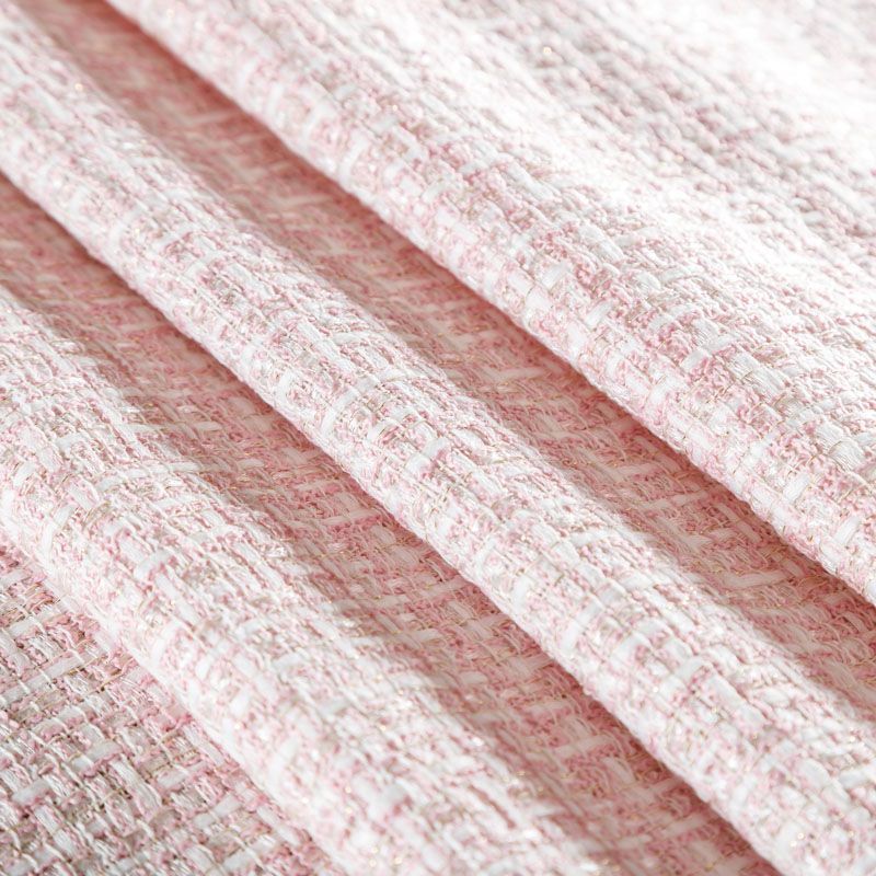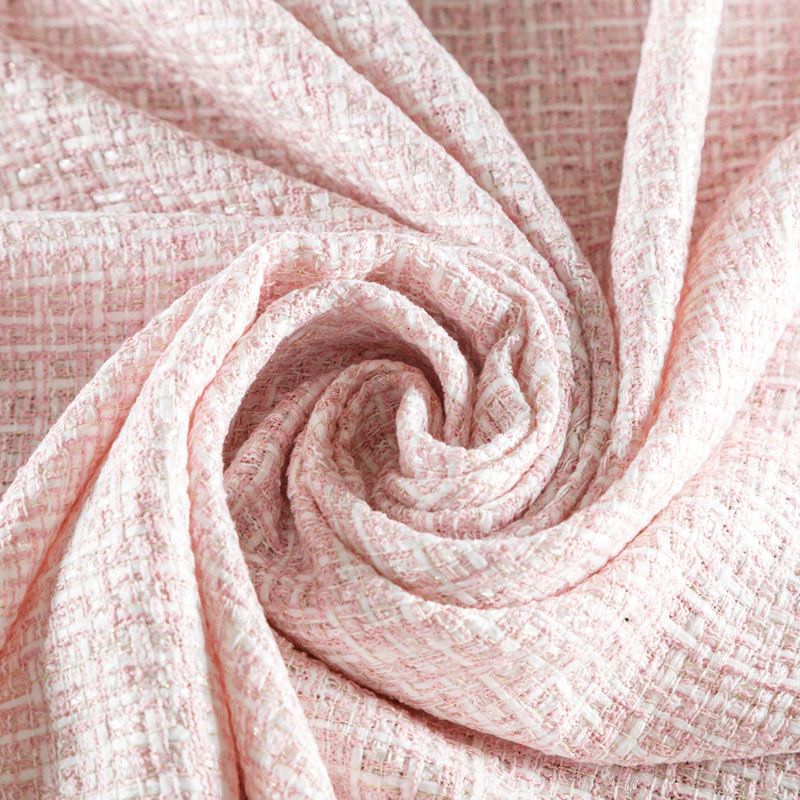 Отличительная особенность этой ткани в полотняном плетении нитей, характерного для рогожки, олицетворяющая сложную "клетчатую" геометрию в розово-молочных оттенках. Различная толщина нитей создает эффектную фактуру. Ткань достаточно формоустойчивая, при этом пластичная, гибкая за счет плетения,  матовая, мягкая, приятная на ощупь, не рыхлая. Прекрасно подойдет для пошива жакета, юбки в виде трапеции, легкого пальто, костюма.