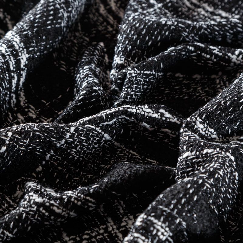 Мягкая, пластичная и объемная ткань, с разреженной и рельефной вывязанной структурой. Буклированный твид в стиле Шанель буквально соткан из различных по толщине и текстуре нитей, образующих рисунок в виде клетки. В плетение добавлена блестящая люрексная нить. Твид идеально подходит для пошива платьев, юбок, жакетов, легких пальто, эффектных бомберов и курток.