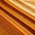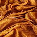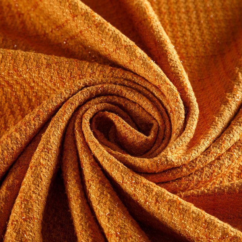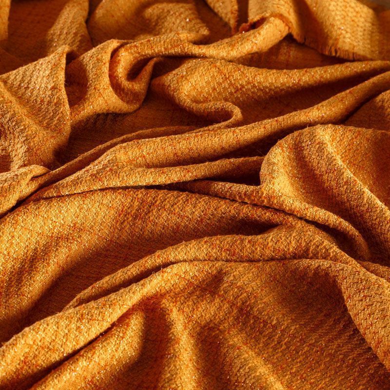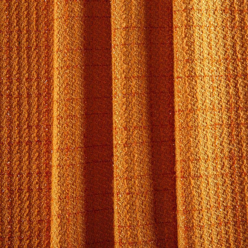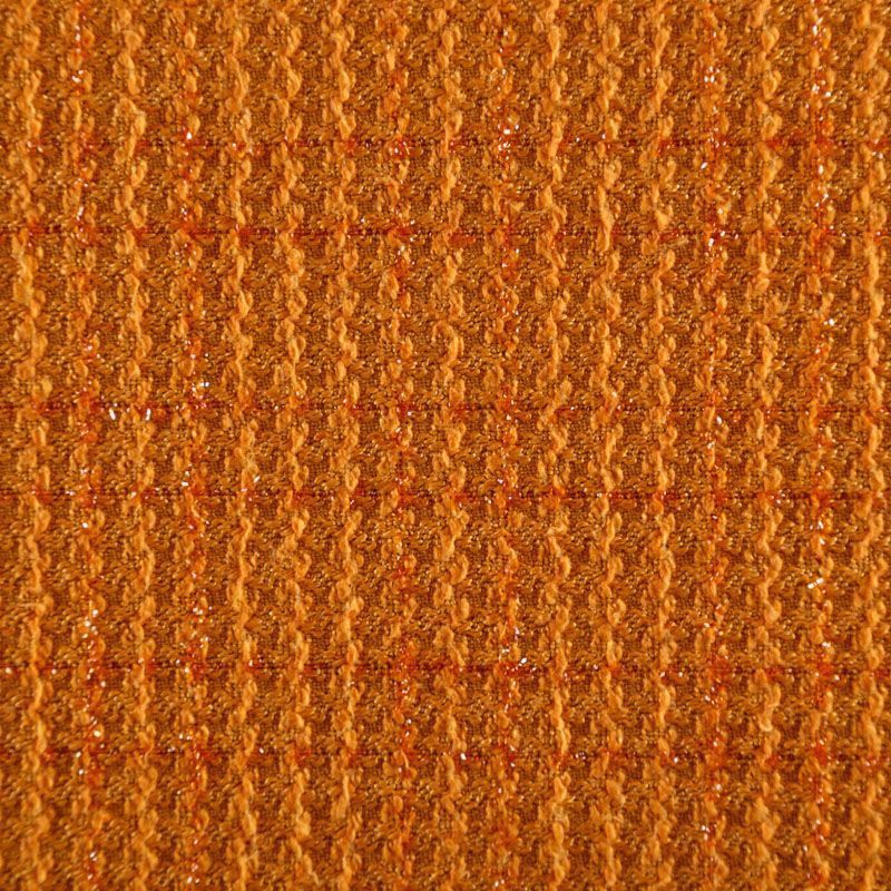 Твид средней плотности с рельефной поверхностью оранжевого оттенка с добавлением акцента в виде люрексовой нити, которая имитирует клетку и добавляет ткани нарядности. Твид пластичный, хорошо драпируется, умеренно держит форму, прекрасно подойдет для пошива жакетов на подкладе, жилетов, кардиганов, легких пальто, юбок и платьев.