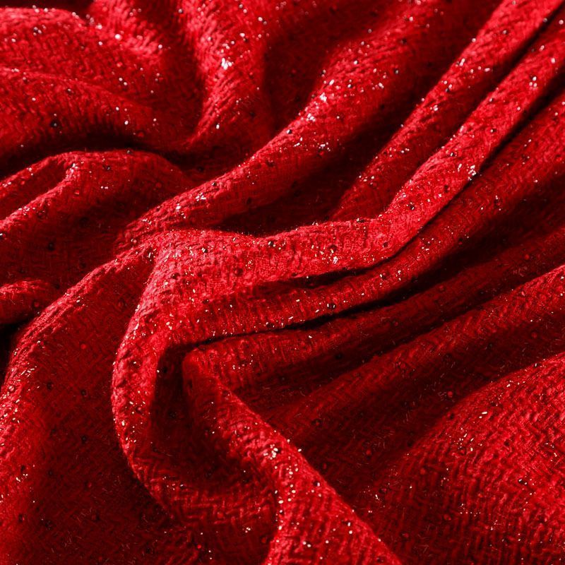 Плотный, в меру объемный твид с легким эффектом букле из нитей рубиново-красного оттенка с добавлением акцента в виде люрексовой нити и страз в цвет ткани. Твид пластичный, хорошо драпируется, умеренно держит форму, прекрасно подойдет для пошива жакетов на подкладке, жилетов, кардиганов, легких пальто, юбок и платьев.
