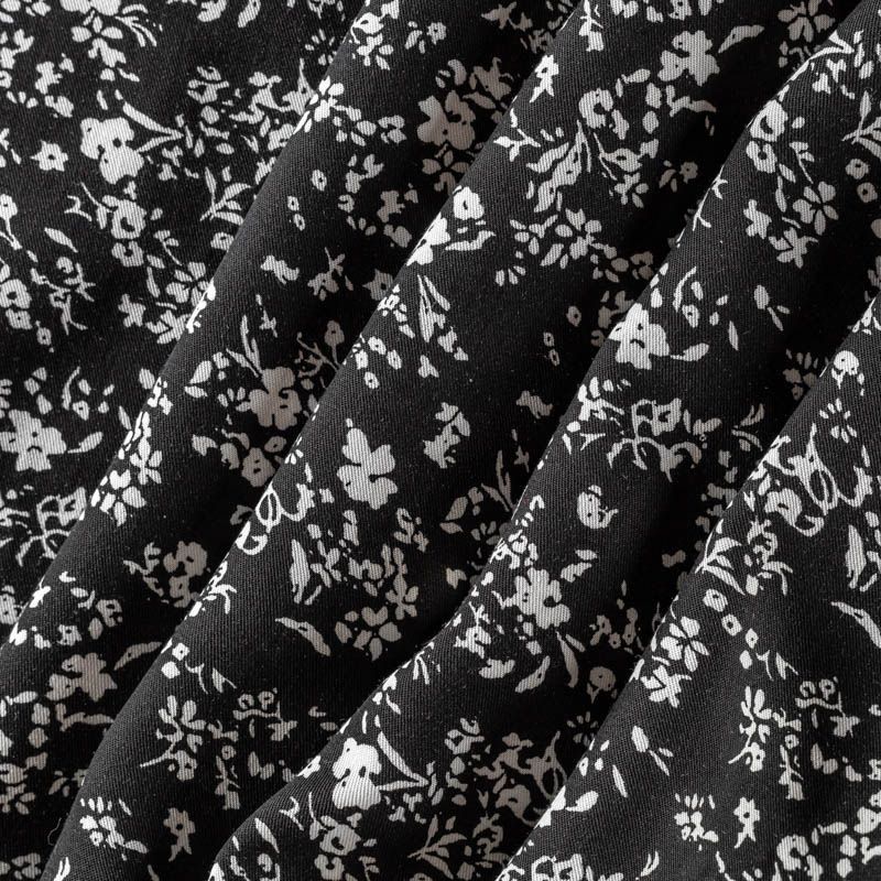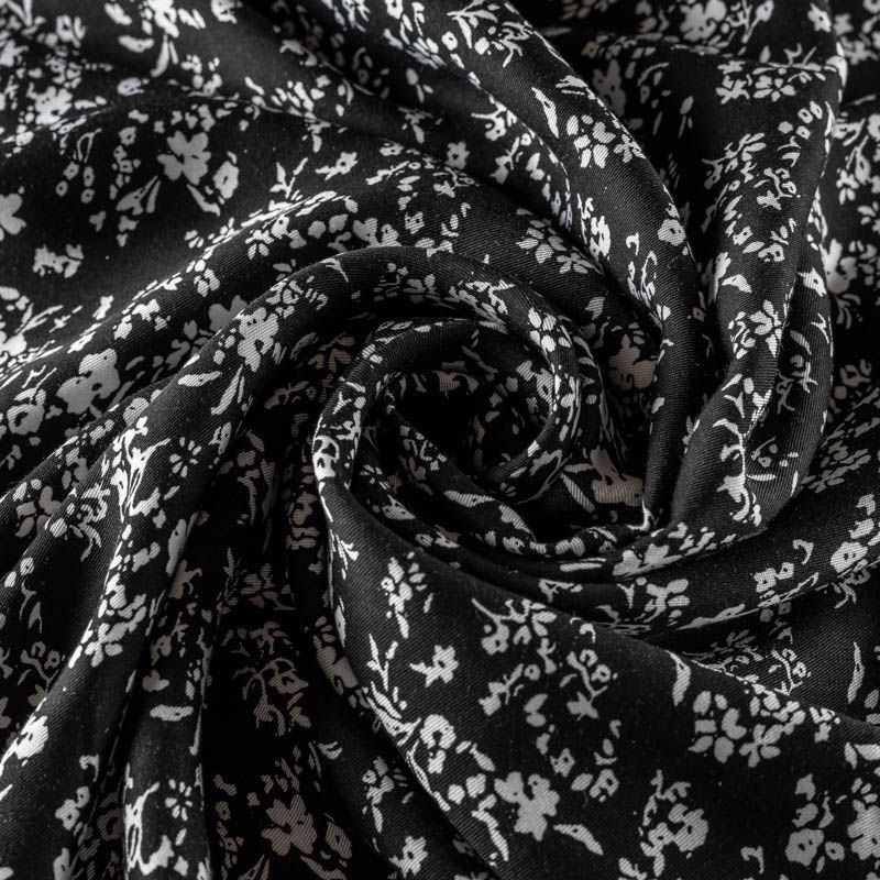 Качественный вискозный твил-штапель с нежным принтом из мелких букетиков на контрастном черном фоне. Мягкая ткань средней плотности, имеет саржевое плетение и характерный диагональный рубчик на поверхности. Хорошо сохраняет форму, не сильно мнется и не деформируется в процессе эксплуатации. Красиво ложится в складки, поэтому прекрасно подойдет на длинные драпированные юбки и платья, туники, на свободные брюки или шорты, топы.