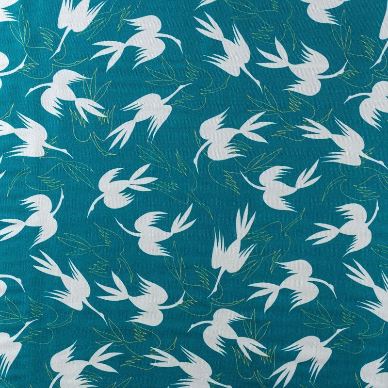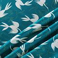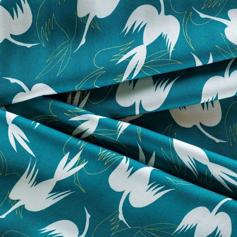 Итальянский вискозный твил-штапель со стилизованным принтом в виде летящих птици темно-бирюзового оттенка. Мягкая ткань средней плотности, имеет саржевое плетение и характерный диагональный рубчик на поверхности. Хорошо сохраняет форму, не сильно мнется и не деформируется в процессе эксплуатации.  Красиво ложится в складки, поэтому прекрасно подойдет на длинные драпированные юбки и платья, туники, на свободные брюки или шорты, топы.