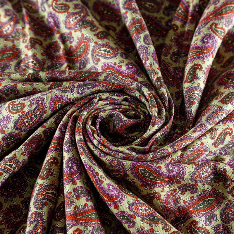 Плотная и мягкая ткань фисташкового цвета с цветным узором пейсли, имеет саржевое плетение и характерный диагональный рубчик на поверхности. Отлично сохраняет форму, не сильно мнется и не деформируется в процессе эксплуатации. Красиво ложится в складки, поэтому прекрасно подойдет на длинные драпированные юбки и платья, на свободные брюки или шорты, топы.