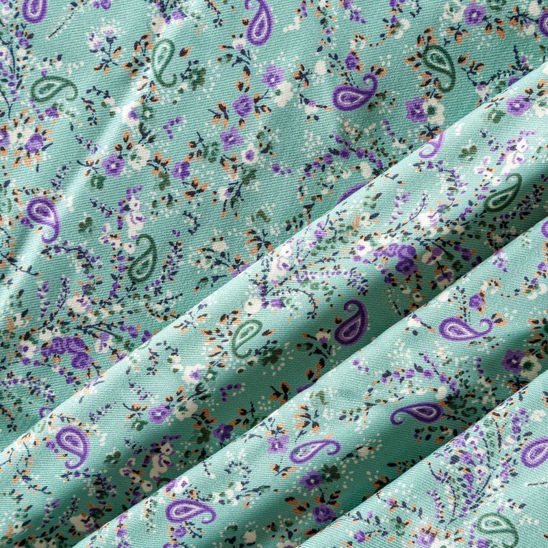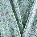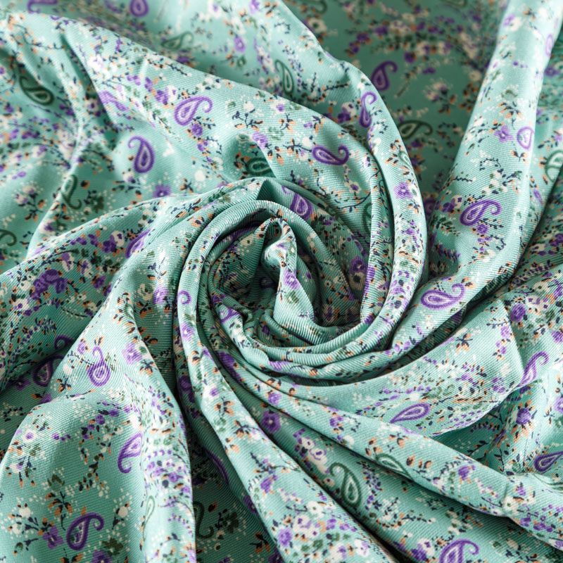 Плотная и мягкая ткань мятно-бирюзового оттенка с ярким мелкоцветом, имеет саржевое плетение и характерный диагональный рубчик на поверхности. Отлично сохраняет форму, не сильно мнется и не деформируется в процессе эксплуатации. Красиво ложится в складки, поэтому прекрасно подойдет на длинные драпированные юбки и платья, на свободные брюки или шорты, топы.