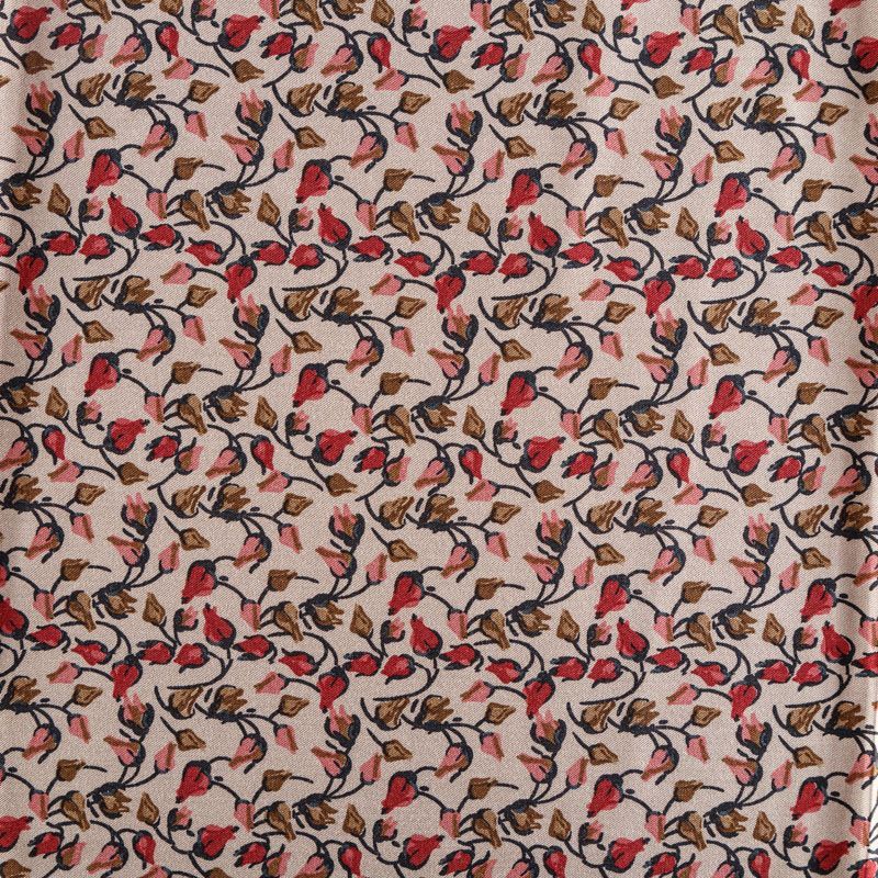 Плотная и мягкая ткань песочного оттенка с мелкоцветным принтом, имеет саржевое плетение и характерный диагональный рубчик на поверхности. Отлично сохраняет форму, не сильно мнется и не деформируется в процессе эксплуатации. Красиво ложится в складки, поэтому прекрасно подойдет на длинные драпированные юбки и платья, на свободные брюки или шорты, топы.