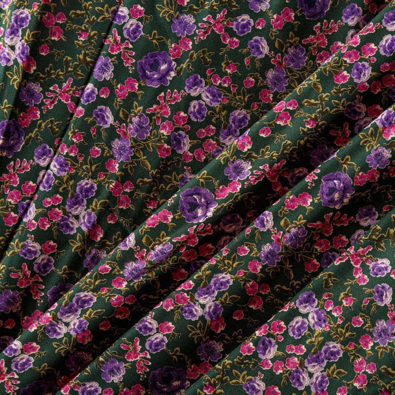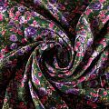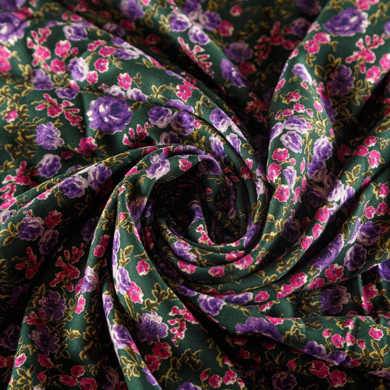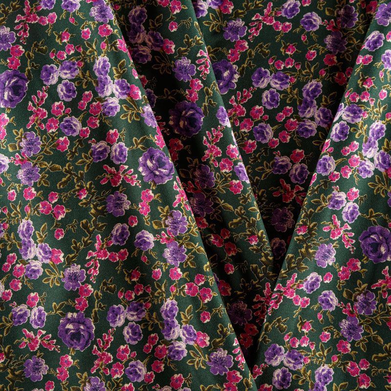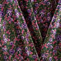 Плотная и мягкая ткань темно-зеленого цвета с ярким цветочным принтом в розово-фиолетовых оттенках, имеет саржевое плетение и характерный диагональный рубчик на поверхности. Отлично сохраняет форму, не сильно мнется и не деформируется в процессе эксплуатации. Красиво ложится в складки, поэтому прекрасно подойдет на длинные драпированные юбки и платья, на свободные брюки или шорты, топы, комбинезоны, а также для домашней одежды.